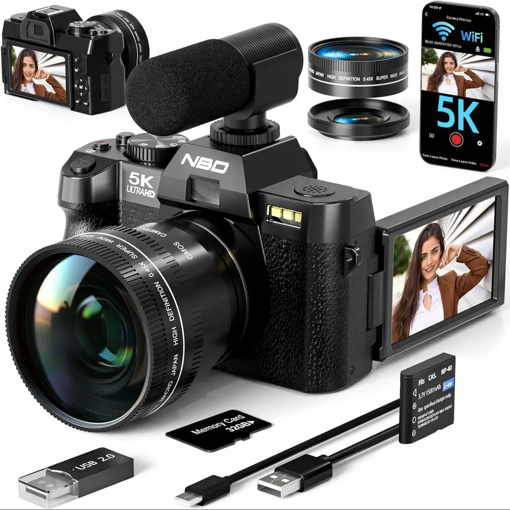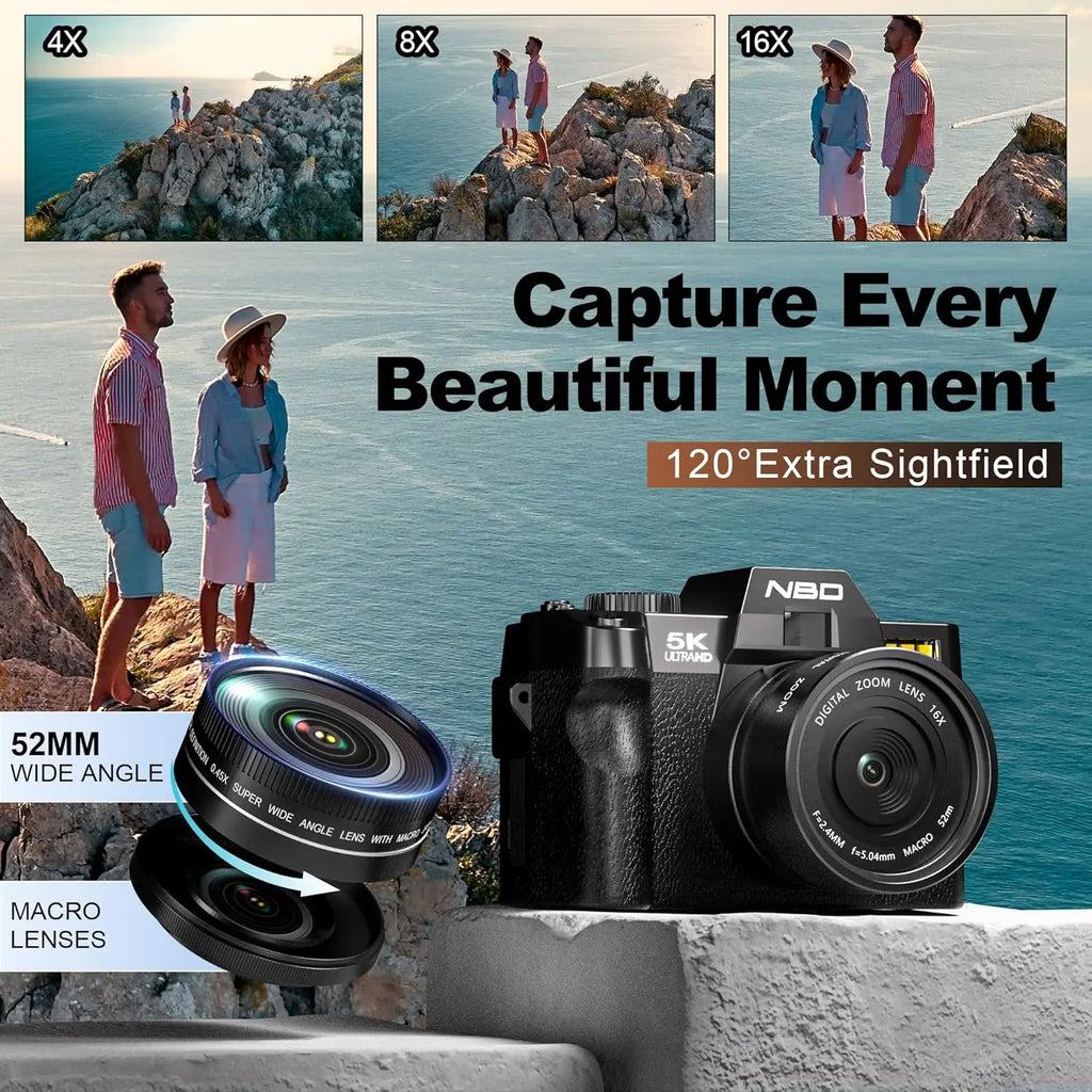 【5K Digital Camera with 180° Flip Screen】The NBD digital camera redefines quality with its ability to capture vibrant 48MP photos and record ultra-crisp 5K videos at 30fps or 4K videos at 60fps. Its 3-inch touchscreen flips 180°, making it perfect for selfies, vlogging, and creative angles. The package includes a 52mm wide-angle and macro lens, enabling versatility for all your shooting needs.