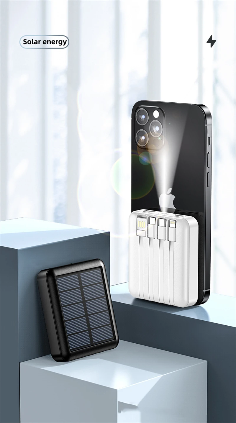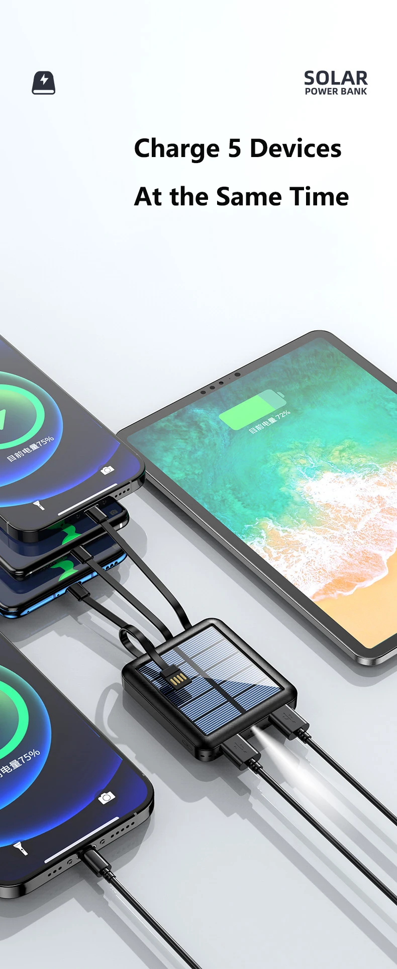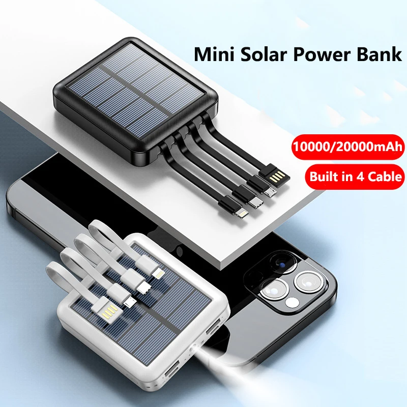 20000mAh Mini Solar Power Bank with 4 Cable Light Portable External Battery Charger for iPhone 15 Huawei Samsung Xiaomi Powerbank